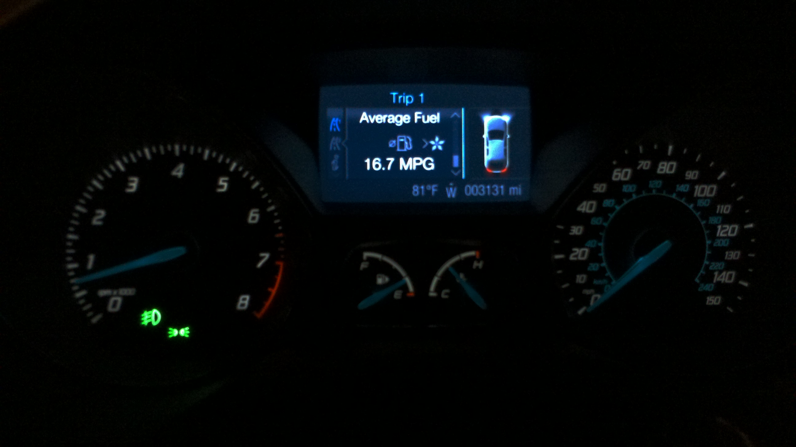 As soon as the Focus was delivered, we jumped right in. We started out babying the throttle to get a clear picture of just how little gas it could consume. By shifting 1/3/5 and lightly using the throttle in uber fuel miser mode, we saw a 33.8 MPG average in the first 10 miles of city-ish driving. That is well beyond the EPA rating of 26 city or 30 “combo” and darn close to the 36 highway rating for the five speed manual.